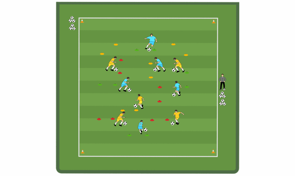 “Moving with the Ball” – A young player moves with the ball in different directions and collects “tunnels” within a 20×20 meter square. A yellow tunnel is worth one point, green is two, and red is four. The player looks around and tries to move as quickly as possible to reach 12 points. The game can be made more complex by changing the time limit, point values, or the number of tunnel options. There can also be two teams competing to collect more points.