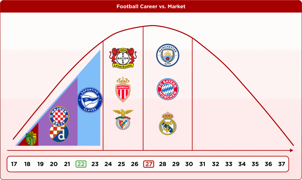 To develop a player who has a potential for a “mother club” Deportivo Alaves, it is important to have a clear understanding of a football market. The football market has its rules which are usually pre-defined by budget, level of player quality and level of competition. If a player holds a potential to reach best clubs at the peak of his career (26-28 yrs old) it is important to make a right steps in his career before that.