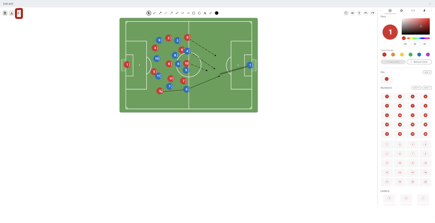 At the top of the drill view, you will find the sketch toolbar used for creating and editing drills. These tools allow you to draw various line types, add arrows and shapes, insert text, and change colors. You can also select and place equipment such as players, dummies, and hurdles. Additional functions include duplicating and mirroring elements, as well as undoing or deleting equipment and drawings.