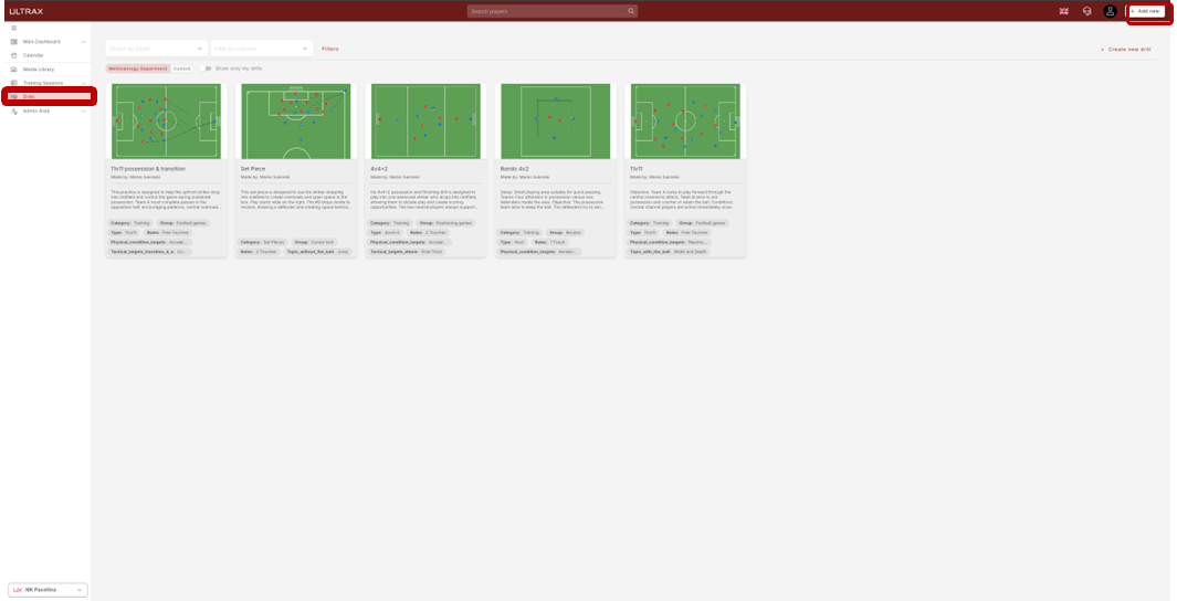 Click on Taladros in the sidebar to access a page containing all of your saved drills. Select Create New Drill to open a pop-up window where you will be prompted to enter basic information.