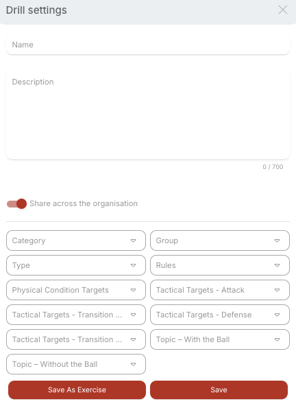 Share Across the Organization – If your organization includes more than one category, you can select “Share Across the Organization.” This allows coaches from other categories to view and use the selected drills.