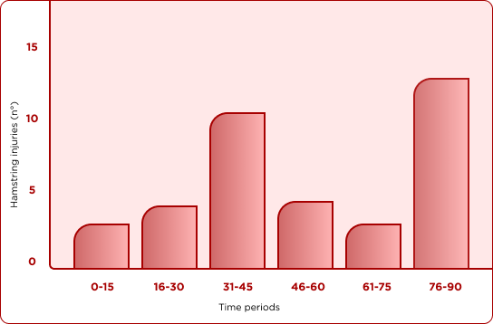 Additionally, young football players are more likely to sustain injuries during the final periods of matches (30–45 min and 75–90 min). Professional players are known to experience decreasing eccentric hamstring strength as a match progresses, increasing injury risk. This highlights the importance of developing fatigue tolerance in youth athletes through targeted training.