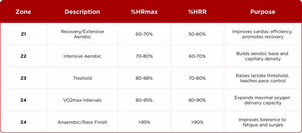 By using both maximum heart rate (HRmax) and heart rate reserve (HRR), we can accurately determine individualized training zones that guide intensity, optimize adaptation, and ensure each session targets the right physiological system (Table 4).