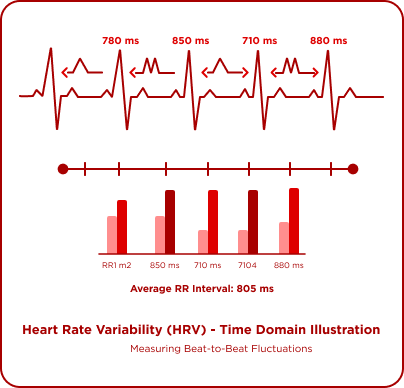 Heart Rate Variability (HRV) (Figure 4) measures the small, natural fluctuations in time between consecutive heartbeats known as R-R intervals