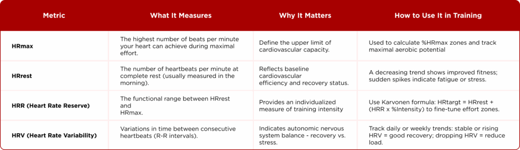 When used alongside HRrest and HRR, HRV provides a third dimension of insight — it captures the autonomic recovery status that pure heart rate data can’t show.
