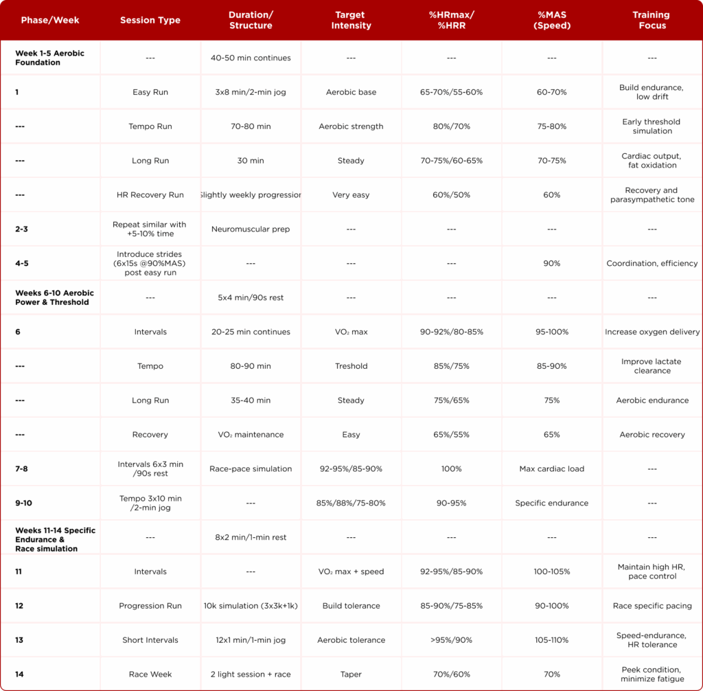 This article dives deep into how your heart learns to run a 10K, connecting the science of cardiovascular adaptation with practical programming. You’ll learn how to use HR, HR Reserve, and the 5-minute MAS time trial to personalize your training zones, and finish with a  14-week HR-based plan that turns science into real-world performance.