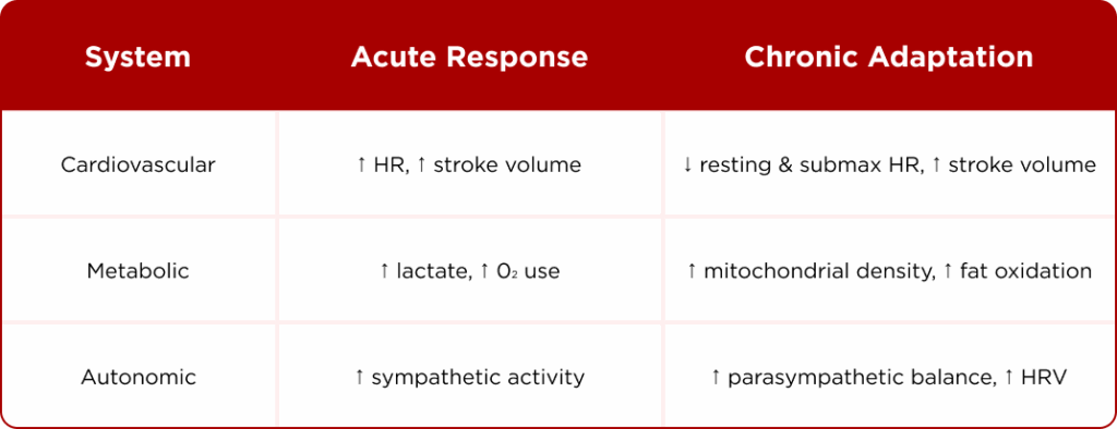 • Recovery HR quickens, showing faster autonomic reactivation.